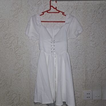 Ağ rəngli qadın paltarı - Romantik dizayn: qısa puff qollar, kvadrat dekolte və bel hissəsində korsetvari bağlama (metallı halqalar və atlas lent). - Yüngül, teksturalı parçadan: xırda relyef naxı...