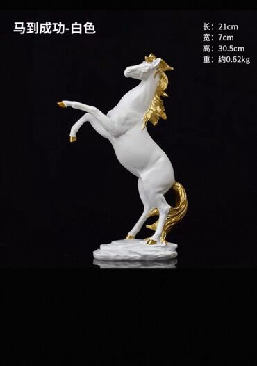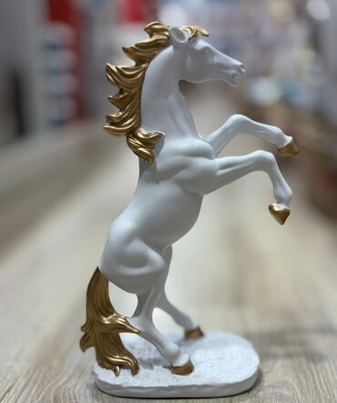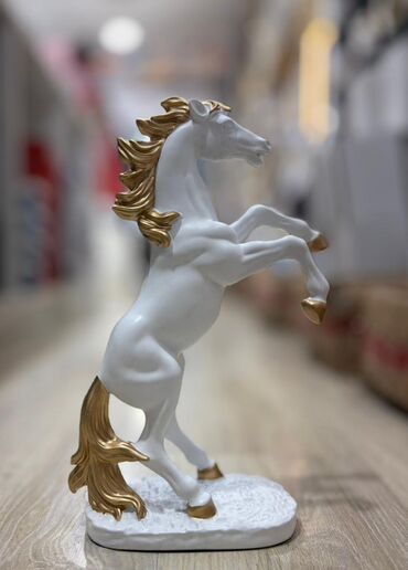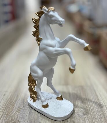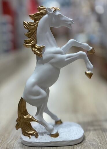Ağ rəngli at fiquru – dekorativ heykəl - Dizayn: Arxa ayaqları üstə şahə qalxmış at kompozisiyası. Ağ mat səth, qızılı yallı və quyruq detallarına, həmçinin qızılı nal vurğularına malikdir. - Mate...