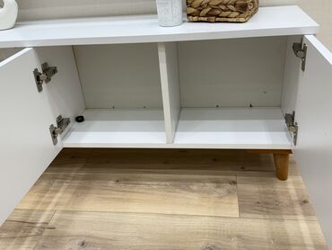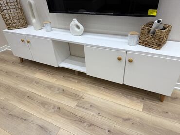 Müasir dizaynlı TV stendi - Rəng: ağ rəf səthləri, qara metal karkas - Material: möhkəm metal çərçivə, hamar laminat/taxta tipli ikiqat rəf - Ölçü təsviri: geniş üst səth böyük ölçülü televizorlar...