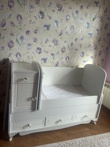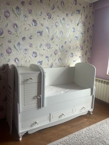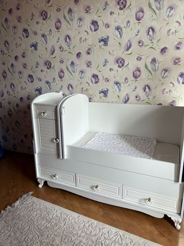 Milana….Uşaq beşiyi – yellenən funksiyalı, 4 yaşa kimi uyğun. - Rəng: ağ - Material: möhkəm taxta konstruksiya - Yan tərəfi sürüşən məhəccər (asanca açılıb-bağlanır) - Alt hissədə 4 ədəd geniş çekm...