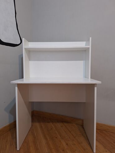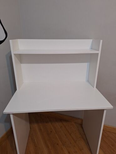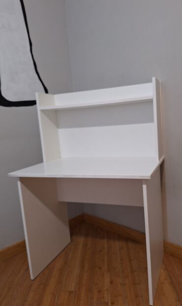 Ağ rəngli yazı/iş masası – üst hissədə inteqrasiya olunmuş rəfli modul