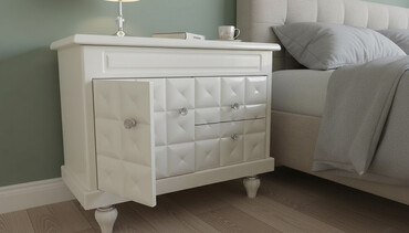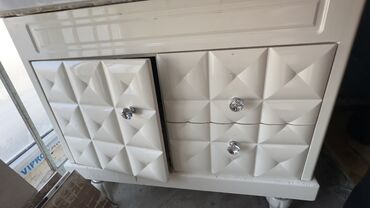 - Alt dolab: Solda qapılı bölmə, sağda iki ədəd çekmece. Ön panellər 3D piramida teksturası ilə dekorativdir. Parlaq xrom effektli düymə formalı tutacaqlar. Ön tərəfdə əlavə dayaq panelləri və klassik üslubda ayaqlar.