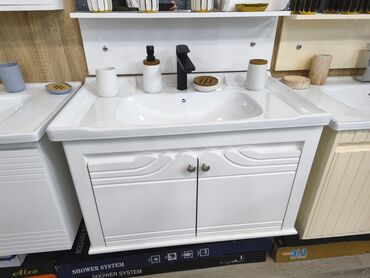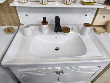 - Material: parlaq ağ rəngli MDF/taxta əsaslı korpus, keramika (monolit) lavabo.