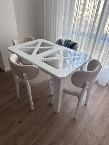 - Masa: düzbucaqlı forma, şüşə üstlük (kənarları cilalanmış), altında dekorativ üçbucaq/kəsişən elementlər. Ağ rəngli baza və ayaqlar, möhkəm konstruksiya. Ailə yeməkləri və qonaqlamalar üçün rahat ölçü (təxminən 4 nəfərlik).