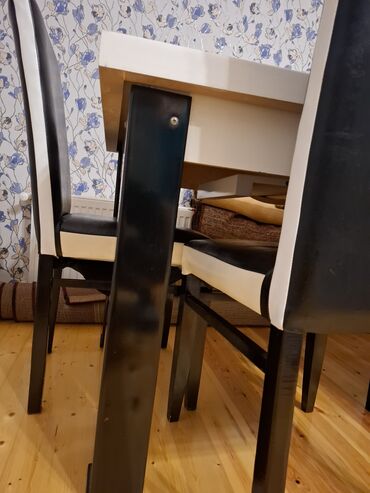 - Rəng kombinasiyası: ağ masa + qara-ağ stullar, interyerlə asan uyğunlaşır.