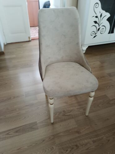 - Stullar: 8 ədəd, yumşaq oturacaq və bel hissəsi; iki rəngli (açıq bej ön hissə, tünd-bej arxa hissə) parçalı üzlük; ağ rəngli konus formalı ayaqlar üzərində qızılı halqa detalları.