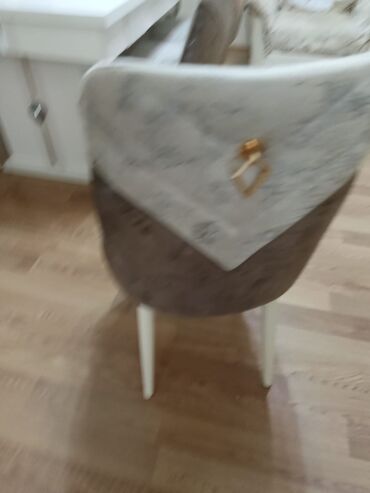 - Arxa hissədə dekorativ qızılı asqı elementi olan stul dizaynı.