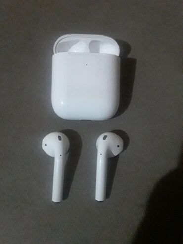 Ağ rəngli simsiz qulaqlıq dəsti və şarj qabı.