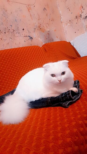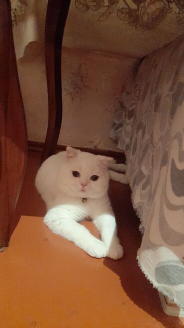 Ağ rəngli, qısa tüklü, qıvrıq qulaqlı pişik. Şotland Fold tipli görünüş: iri, yuvarlaq baş, böyük ifadəli gözlər, qısa və güclü bədən quruluşu, yumru pəncələr. Uzun və sıx quyruq. Boyunbağı zəngi ilə gəlir.