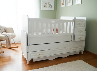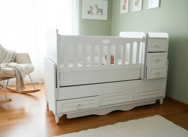 Bu model bir məkanda beşik, komod və saxlama bölmələrini birləşdirərək gündəlik istifadədə rahatlıq yaradır. Uşaq əşyalarını səliqəli toplamaq və beşiyə asan çıxış üçün ideal seçimdir.