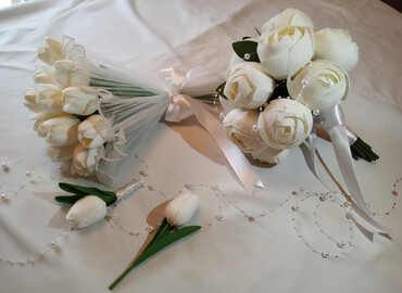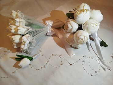 - 1 ədəd nişan/qoltuqaltı buket: ağ lalələr formalı güllər, tül örtük və mirvari bəzəklər, ağ lent.
