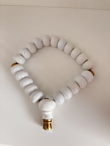 Əl işi ağ rəngli muncuqlardan hazırlanmış təsbeh, hər biri dəyirmi formada və səliqəli şəkildə düzülmüşdür. Təsbehin ucunda qızılı rəngli metal detallarla bəzədilmiş xüsusi bir hissə var. Mirvaridən düzəldilib təmiz əl işidir.
