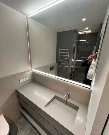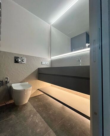 Ağ rəngdə divara quraşdırılmış unitaz. Üzərində mikser başlıqlı, inteqrasiya olunmuş lavabolu, boz rəngli dolab olan müasir üslubda hamam dəsti. Dolabın altında əlavə saxlama yeri üçün açıq rəf var. Böyük güzgü və LED işıqlandırması hamam otağına genişlik və aydınlıq qatır.