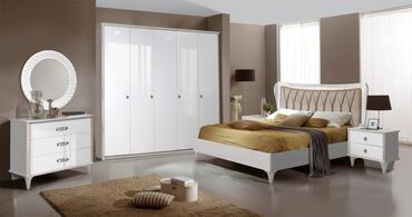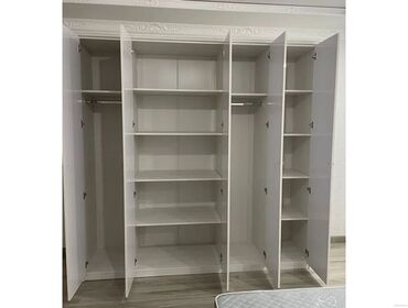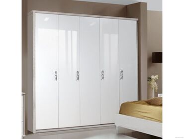 - 5 qapılı paltar dolabı – parlaq ağ ön panellər, dekorativ metal tutacaqlar. İç quruluşu: iki asılqan bölməsi, çoxsaylı geniş rəflər və yan tərəflərdə əlavə rəf blokları.