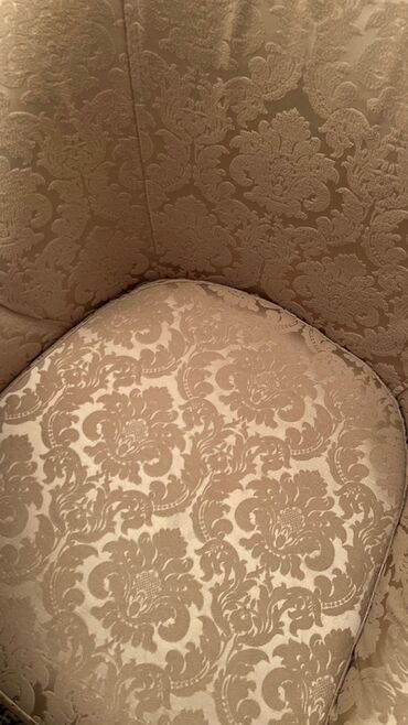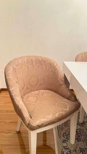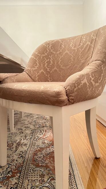 - Stullar: ağ taxta karkas, bej rəngli naxışlı parça üzlük (klassik damask naxışı), yumşaq və erqonomik oturacaq-bel hissə