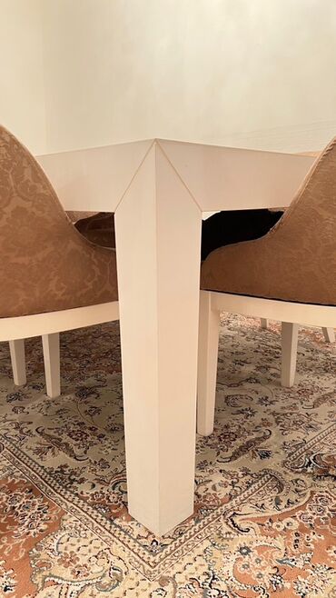- Stil: müasir-minimalist masa + klassik dizaynlı stulların kombinasiyası; işıqlı interyerlərə, geniş qonaq otağı və ya yemək otağına uyğundur