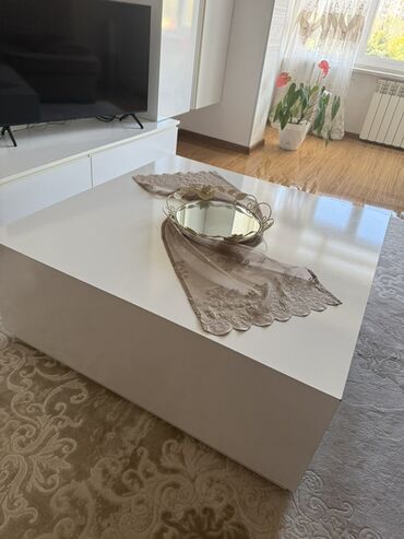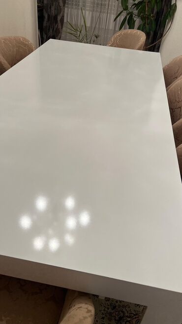 - Masa: parlaq laklı ağ səth, qalın üst tabla, möhkəm düzbucaqlı ayaqlar