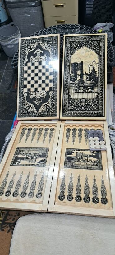 Taxta nərd–şahmat dəsti - Material: ağacdan hazırlanmış qatlanan lövhə - İkiüzlü istifadə: iç tərəfi nərd üçün, üst qapaq hissəsi şahmat üçün damalı taxta kimi işlənib - Dizayn: Şərq ornamentləri ...