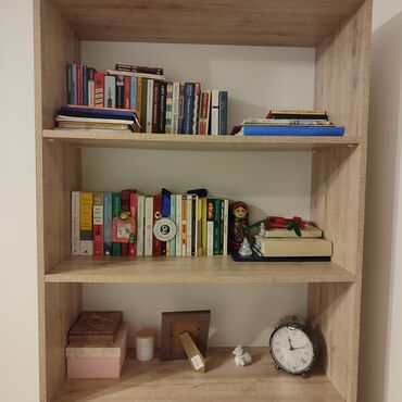 - Üst hissə: 3 geniş açıq rəf – kitablar, dekor və sənədlər üçün