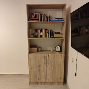 İkiqapılı alt dolabı və açıq rəf bölməsi olan çoxfunksiyalı kitab‑vitrin şkafı.