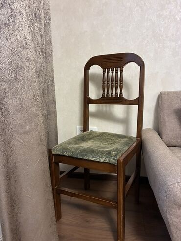- Stul: taxta karkas, bel hissəsində dekorativ şpondetli çubuqlar; oturacaq yumşaq süngərli, naxışlı parça ilə üzlənmiş