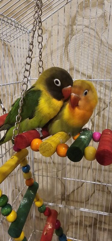 Məhsul: Agapornis (sevda) cüt papuqaylar Təsvir: - Kafesdə saxlanılan iki rəngarəng agapornis cütü - Rənglər: yaşıl-gövdəli, çəhrayı-qırmızı başlı; sarı-gövdəli, çəhrayı-qırmızı başlı - Aktiv və s...