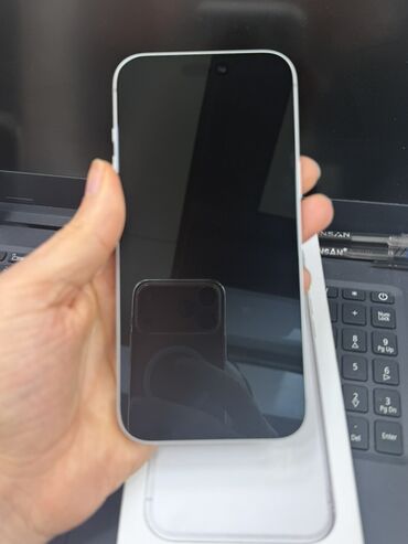 Apple iPhone (ağ rəng) - Korpus: düz kənarlı dizayn, ağ arxa panel, ikiqat kamera modulu və LED flaş - Ekran: Dynamic Island kəsiyi olan tam ekran panel - Kamera: iki arxa obyektivli sistem - Bata...