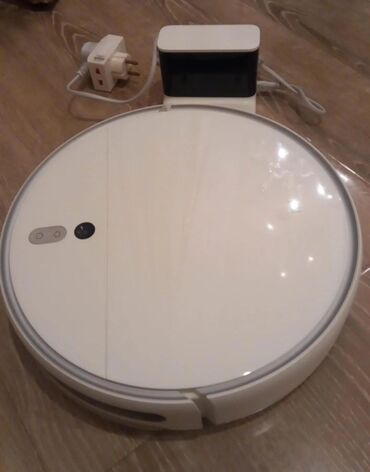 Ağıllı robot tozsoran – dairəvi dizayn, ağ korpus. Komplektdə şarj stansiyası və adapter kabeli var.