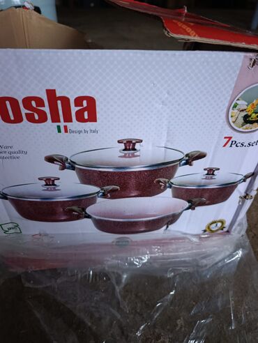 Aura qazan dəsti. 7 parçadan ibarətdir. 3 qazan 3 qapaq və süzgəc(və ya parovarka). Yenidir, istifadə olunmayıb. Böyük qazanın bor qulpu əyri və qırağında qırığı olduğu ücün endirim olunacaq
