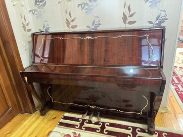 Upright pianino – “Аккорд” (SSSR istehsalı) - Korpus: tünd qəhvəyi, laklı taxta örtük, ön paneldə dekorativ qızılı elementlər - Marka/emblem: “Аккорд”, korpusda SSSR nişanı - Klaviatura: klassik 8...