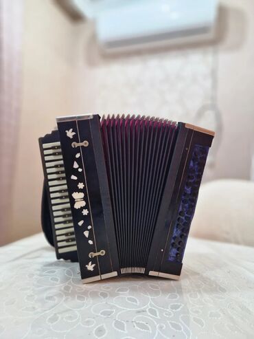 Akkordeon – klavişli və bas düyməli - Tip: Klavişli akkordeon (piano klaviaturası) və sağ tərəfdə bas/akord düymələri - Korpus: Qəhvəyi-mərmər fakturalı örtük, metal yan qapaqlar, klassik keçə kör...