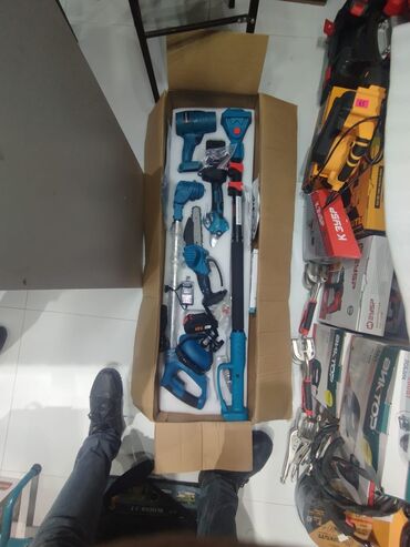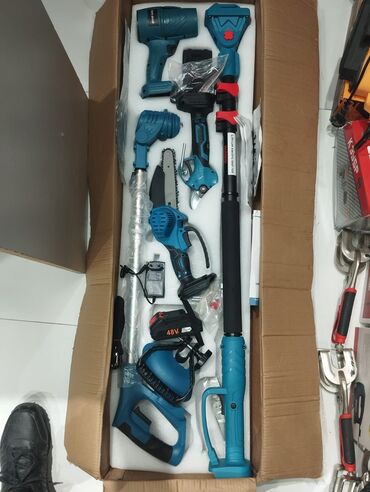 Akkumulyatorla işləyən çoxfunksiyalı alət dəsti müxtəlif təmir və tikinti işləri üçün uyğundur. Dəstə bir neçə əsas alət daxildir: zərbəli qazma, uzun saplı budama mişarı, qısa saplı budama mişarı, elektrik mişarı və kiçik əl mişarı. Alətlər mavi rəngdədir və 48V akkumulyatorla təchiz olunub. Bu dəst, bağçılıq işlərindən tutmuş, evdə kiçik təmir işlərinə qədər geniş tətbiq sahəsi təklif edir.