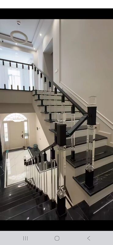 Aluminium ve suseli məhəccər istehsalı və quraşdırılması - Dizayn: Minimalist və müasir xətlər; düzbucaqlı formalar, gizli bərkidicilər və səliqəli keçidlər. - Mərmər pilləkənlər: Ağ və qara damar...