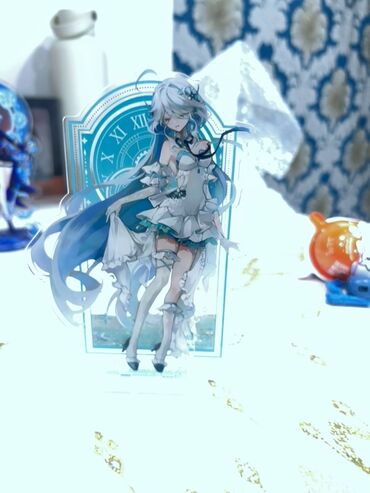 Akrilik masaüstü fiqur – anime üslublu obraz - Material: şəffaf akril, parlaq çap - Növ: 2 hissəli akril stend (fiqur + dairəvi baza) - Dizayn: mavi tonlarda fantastik obraz, uzun paltar və çubuql...