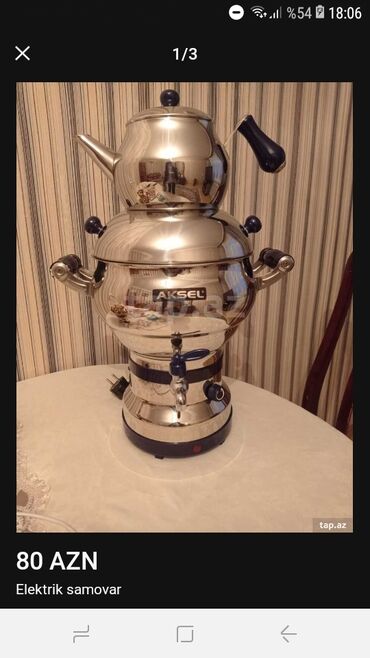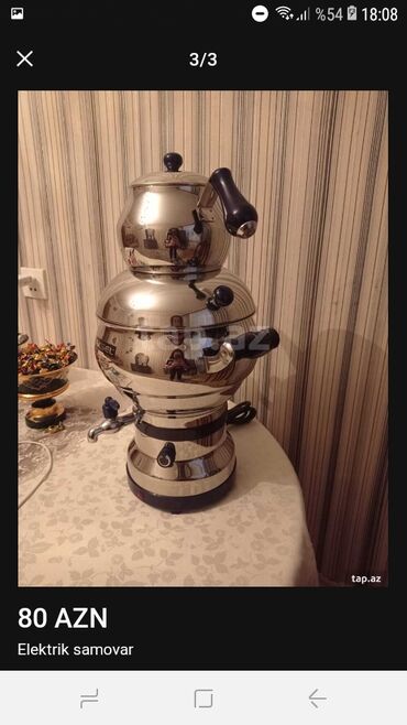 Elektrik samovar Paslanmaz poladdandır. Çox az sayda mövcud olan samovardır. İnternetden araşdıra bilərsiz. Real alıcılar yazsın. - Material: parlaq paslanmayan polad (xrom örtük), dekorativ naxı...