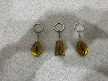 - 3 ədəd açarlıq/brelok. Sarı şəffaf resin içində real skorpion maketi yerləşdirilib. Fərqli formalar: iki ədəd damla formalı, bir ədəd düzbucaqlı. Metal halqa və zəncir hissəsi sayəsində açarlara, çantaya və avtomobil açarlarına bərkidilir. Asqının ölçüsü təxmini: 3–4 sm, halqa diametri təxmini: 2,5–3 sm.