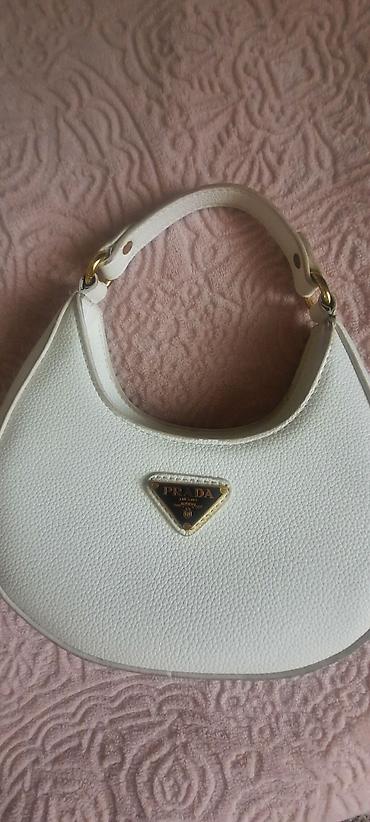 - Çanta: ağ rəngli, xırda dənəli teksturalı material; yarımdairəvi “shoulder bag” silueti; tənzimlənən qısa qoşqu; qızılı metal halqalar və ön hissədə üçbucaq loqolu emblema (PRADA Milano). Gündəlik və gecə kombinlərinə uyğun kompak tutaş.