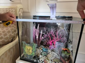 - Şüşə akvarium, üstten filtrləmə bölməsi ilə (arxa hissədə bölməli sump quruluşu görünür).