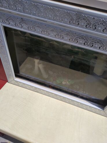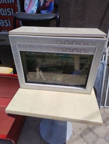 Ağ rəngli, naxışlı çərçivəyə malik akvarium. İçərisində dekorativ bəzəklər və dibində müxtəlif rəngli daşlar var. Akvarium balıqlar və ya digər su canlıları üçün rahat bir yaşayış mühiti təmin edə ...