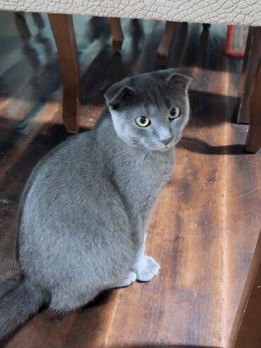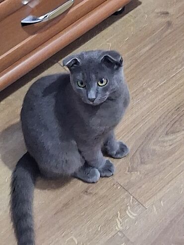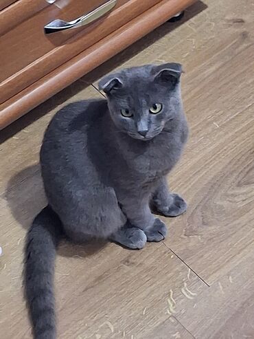 Erkekdir 1yaş 6 aylıqdır peyvend vurulub Skotiş Fold (qatlanmış qulaqlı) pişik - Rəng: Bərk boz (blue/boz) - Gözlər: Kəhrəba rəngli - Yelləncək quyruq, yumşaq qısa tüklü kürk - Qulaqlar tipik “fol...