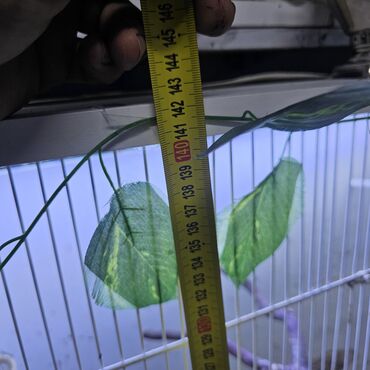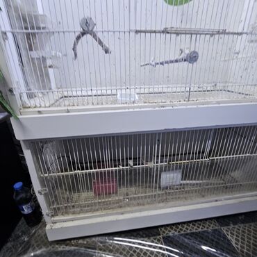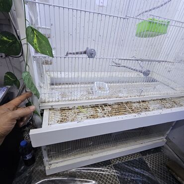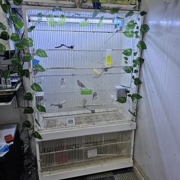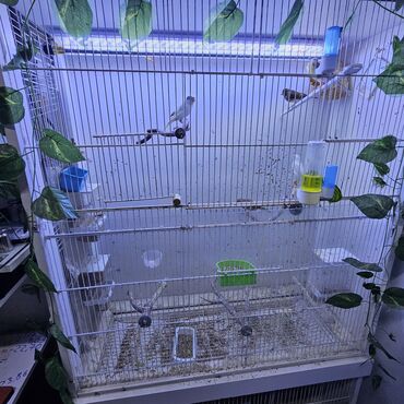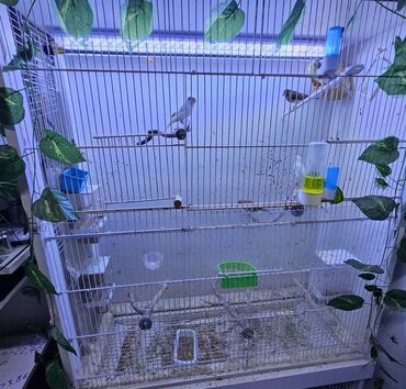 Dalğalı papağan və qəfəs dəsti - Növ: dalğalı (ağ-sarı başlı, yaşıl bədənli) kiçik papağan - Qəfəs: bənövşəyi altlıq və ağ metal barmaqlıqlar, şarjvari qövs damlı dizayn - Ölçü: hündür, geniş hərə...