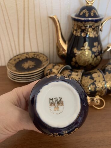Porsele qəhvə fincanları dəsti – 6 ədəd - Material: nazik porselen - Rəng və naxış: tünd lacivərt fon üzərində qızılı barokko üslublu ornament və güllü medalyonlar - Daxili səth: ağ, hamar - Tutac...