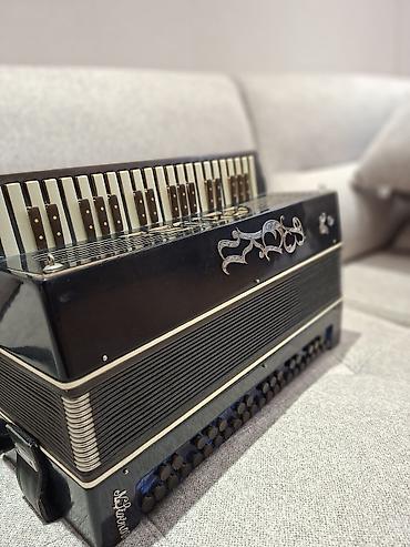 Akkordeon – klavişli və bas düyməli - Tip: Klavişli akkordeon (piano klaviaturası) və sağ tərəfdə bas/akord düymələri - Korpus: Qəhvəyi-mərmər fakturalı örtük, metal yan qapaqlar, klassik keçə kör...