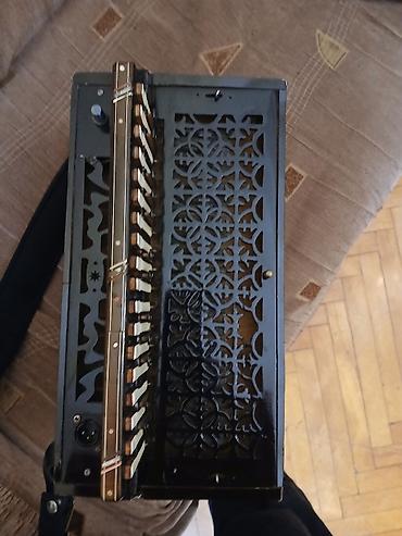 Köhnə tip harmonika (akkordeon) – nadir kolleksiya nümunəsi. Xüsusiyyətlər: - Klaviatura: sağ tərəfdə pianino tipli düymələr - Sol tərəf: bas və akord düymələri - Korpus: qara rəng, ana-boya naxış...