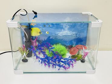 Akvarium satılır(uzunluğu45sm, eni25, hündürlüyü 30sm ) su qiızdırıcısı,hava filtri,süni ot bəzək daşları.2 aylıq yemi, akvariumun dibini təmizləyən.