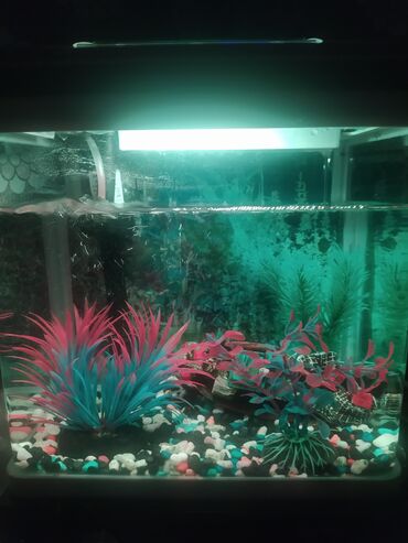 Akvaryum ve 4 eded balığ 2 si qızıl balığdır İstifadə üçün qeyd: - Filtr və havalandırmanı qoşaraq suyun təmizliyini təmin etmək - Çınqılın yuyulması və suyun dövri yenilənməsi - Kiçik və orta ölç...