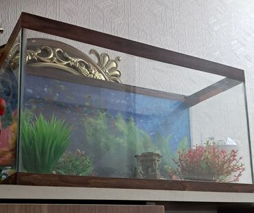 Akvaryum dəsti - Şüşə akvaryum, qara dekorativ çərçivə ilə - İçlik: fon şəkli, dekorativ daşlar və ağac, süni bitkilər, çoxrəngli çınqıllar - Avadanlıq: elektrikli daxili filtr/kompressor, hava şl...