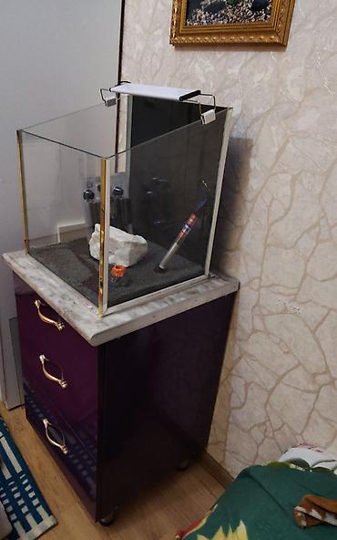 - Şüşə akvaryum: çərçəvəsiz, şəffaf şüşə, kvadrat forma. Kənarlarda bəzək zolaqları, arxa fon qara.