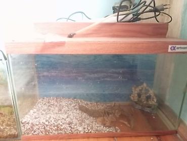 - Şüşə akvaryum: düzbucaqlı forma, ön/yan divarlar şəffaf. Ön ölçülər təxmini orta həcmli (balıq və xırda su canlıları üçün uyğundur). Arxa fon olaraq dəniz mənzərəsi yapışdırılıb.