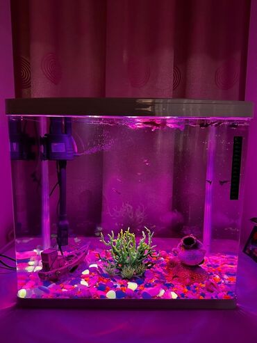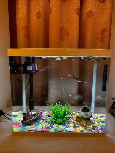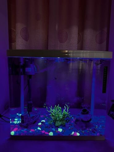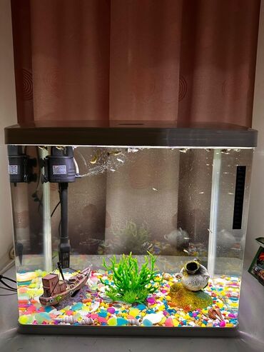 Bu standart düzbucaqlı şüşə akvaryum balıq saxlamaq üçün əlverişlidir. Akvaryumun üst hissəsində ağ rəngli plastik çərçivə mövcuddur. Daxilində quraşdırılmış filtrasiya sistemi və termometr yerləşir. Müxtəlif rəngli daşlar və dekorativ elementlərlə təchiz edilmişdir, bu da akvaryuma canlı görünüş verir. İçərisində süni bitki və batmış gəmi maketi kimi bəzək əşyaları var. Akvaryumun işıqlandırması rəng dəyişdirmə qabiliyyətinə malikdir, bu da müxtəlif atmosferlər yaratmağa imkan verir.